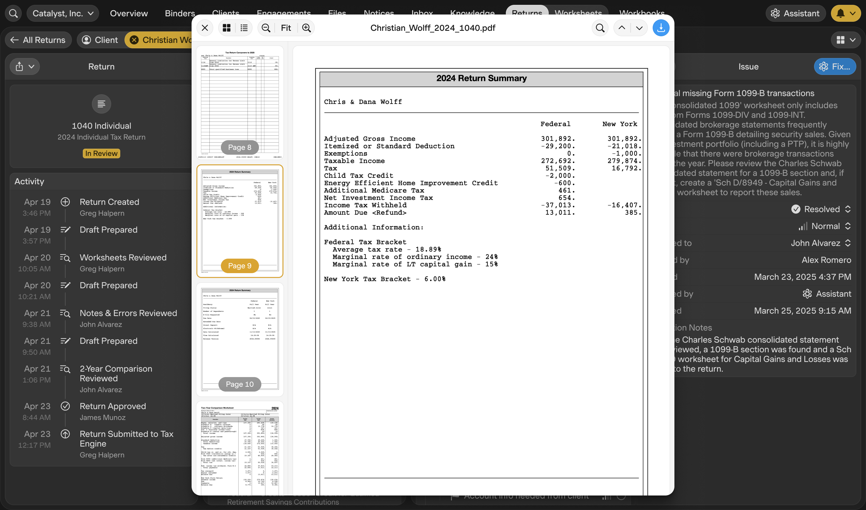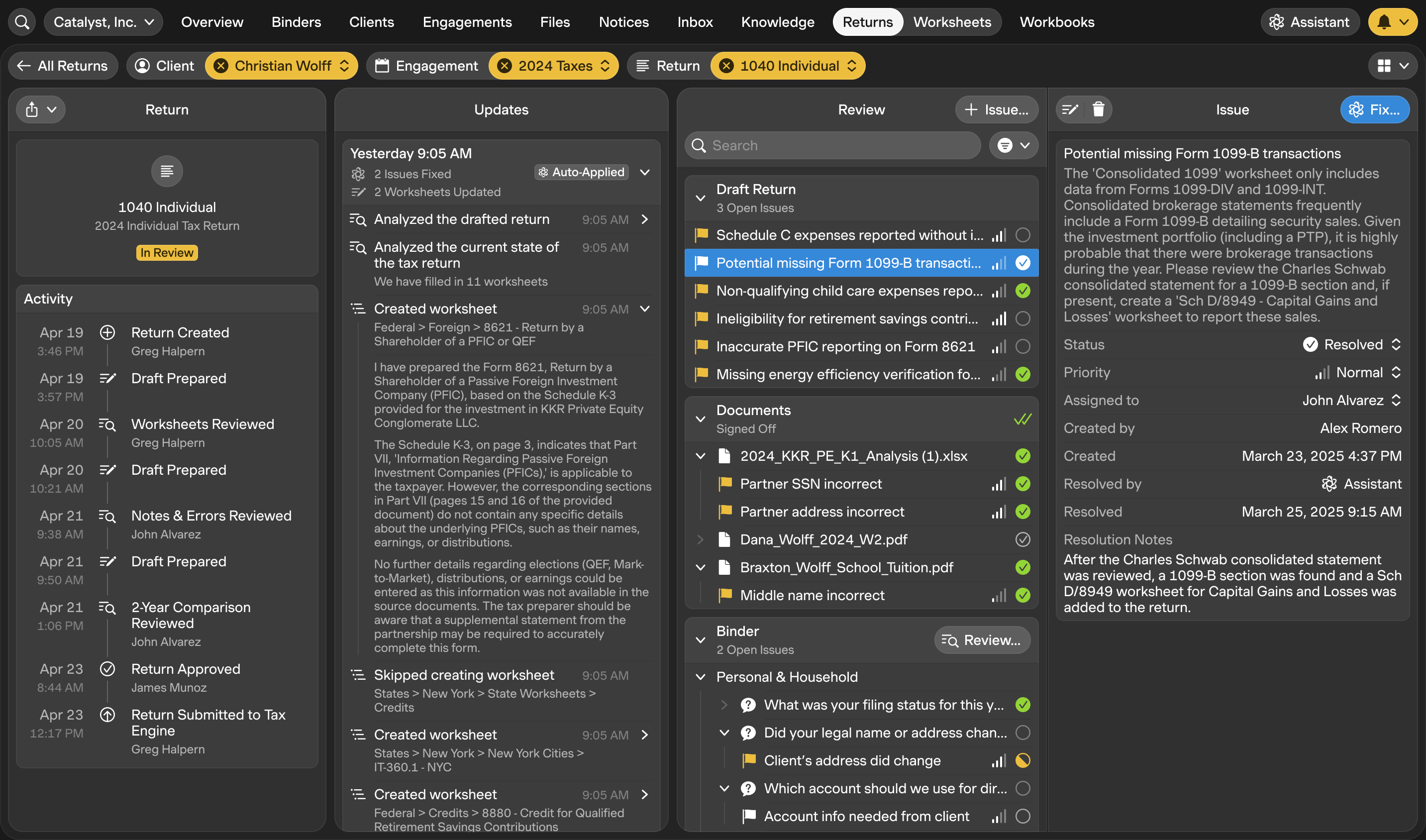 Manage engagements across clients, organize issue lists, assign staff, and stay ahead of due dates so teams begin with clarity and direction.