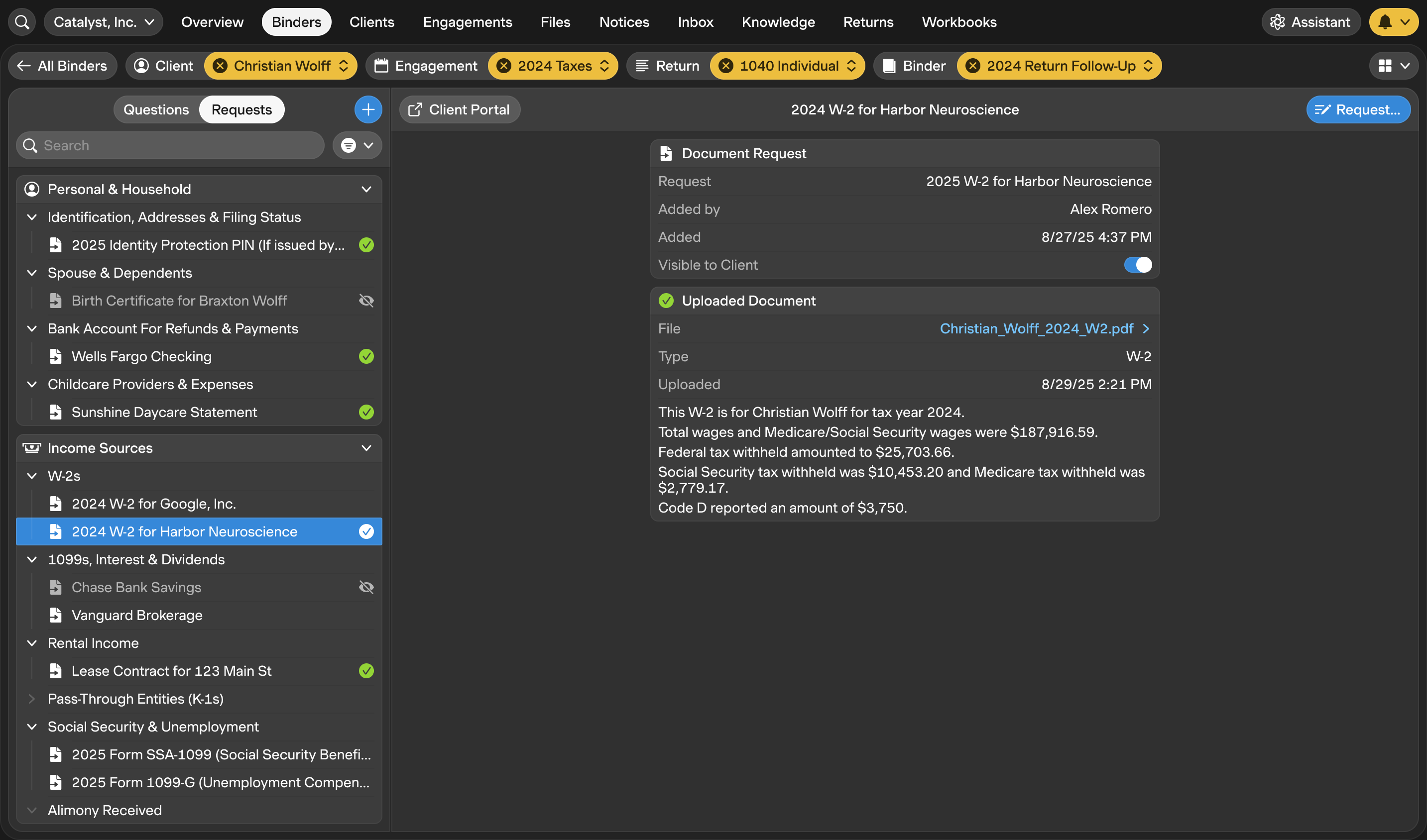 Extract financials, collect supporting documents, and route everything through a secure client portal for clean intake.