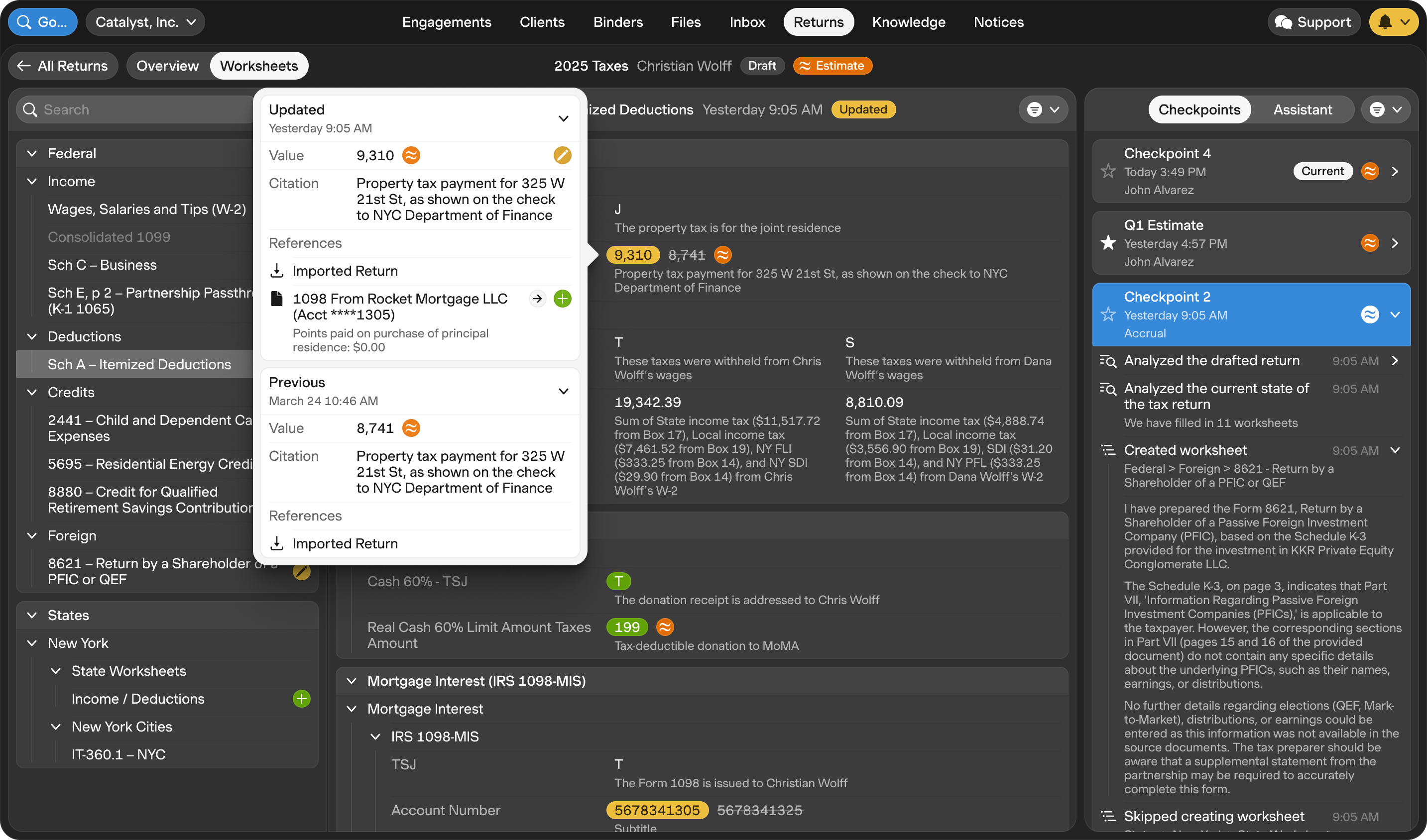 Concretely: if the agent updates the Schedule A after a client uploads a corrected property tax statement, the checkpoint shows you that one field changed (real estate taxes paid), what the previous value was ($8,741), what the new value is ($9,310), and which document triggered the update. You don't re-review the entire Schedule A. You review the one thing that changed.
