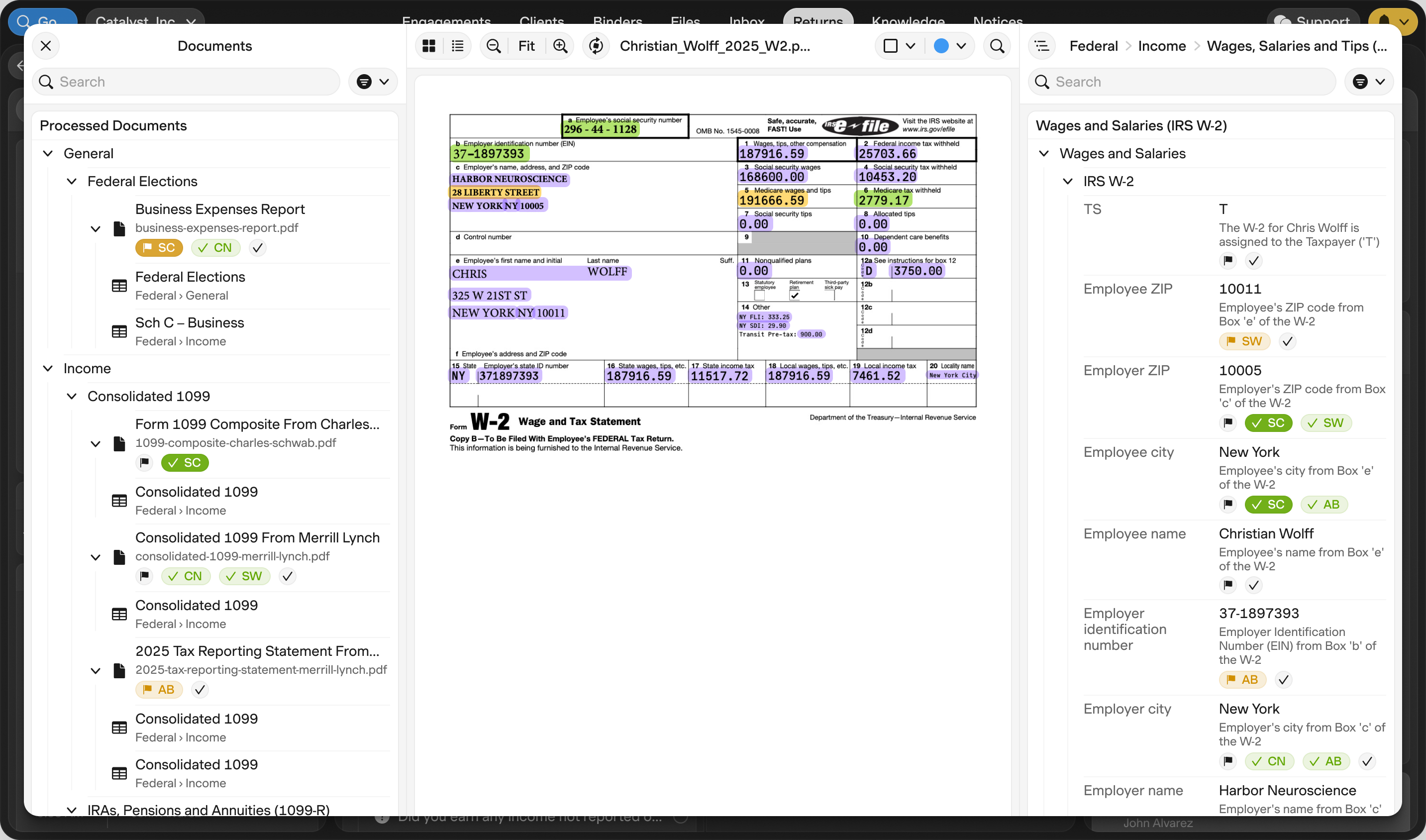 All processed data generates visual bounding boxes that link each value to its precise location in the source document. Whether the value is a single field (Box 1 wages from a W-2) or a calculated aggregate (total farm expenses from a client-provided spreadsheet tallied into a Schedule F), the citation chain is complete. During competitive evaluations, one in five document types processed by Accrual was not supported by the incumbent extraction tool, precisely because those tools relied on fixed templates for a limited set of forms.