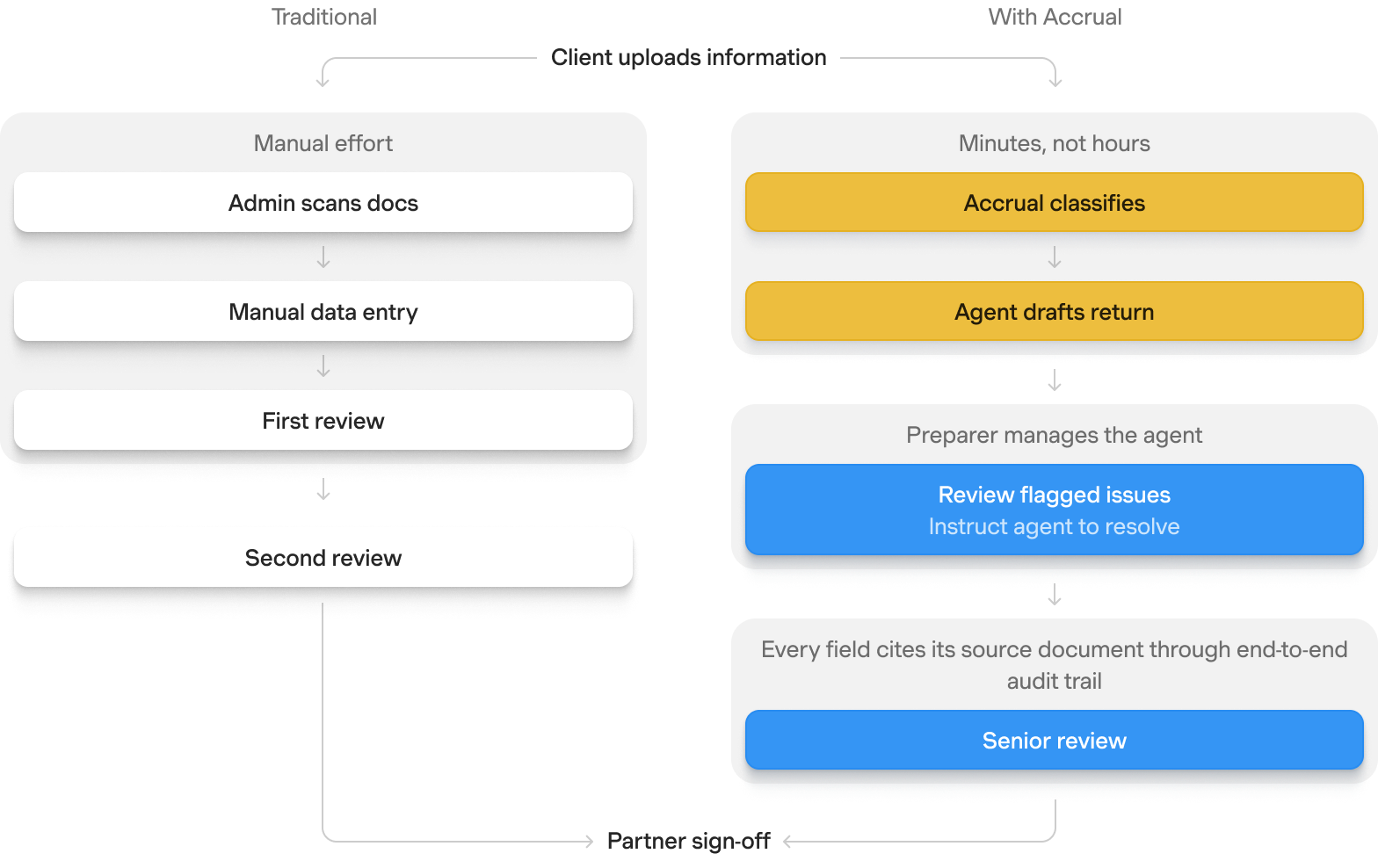 Preparers should expect to spend less time on data entry and more time on technical review. They should expect the agent to flag issues they'd otherwise catch manually, and occasionally miss things that require professional context. The system improves every season as it processes more of the firm's work and as Accrual incorporates feedback into the platform.