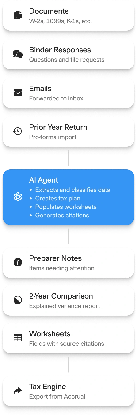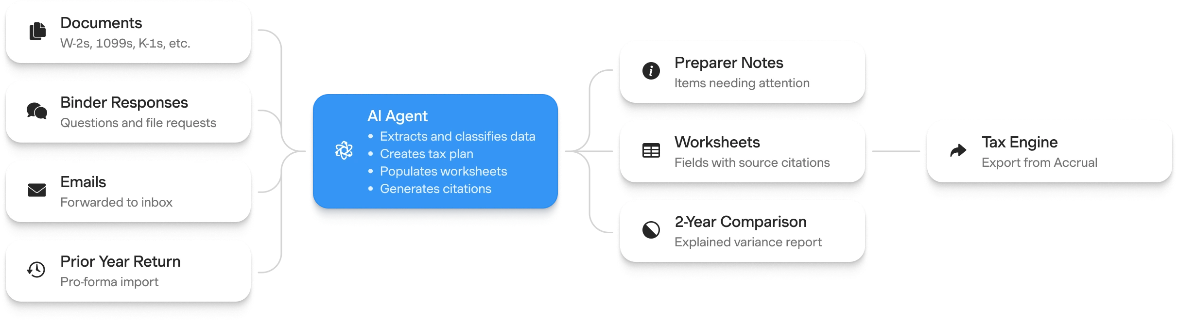 Accrual is built for the reality of accounting inputs, from complex K-1s and 1099s to spreadsheets, emails, photos, and multi-hundred-page statements. Each input is automatically classified, organized, and linked. Deep integrations with existing tax engines enable seamless imports of prior-year returns and carryforwards, as well as clean exports, so firms can continue working within the systems they already trust. As data moves through Accrual, the platform builds a coherent understanding of each client’s financial footprint: what each document represents, what has changed year over year, and where anomalies emerge.